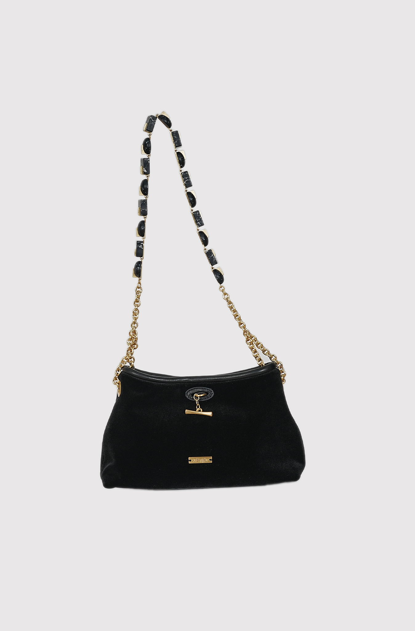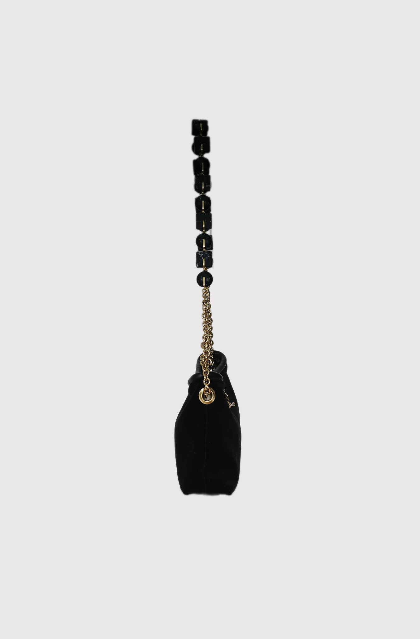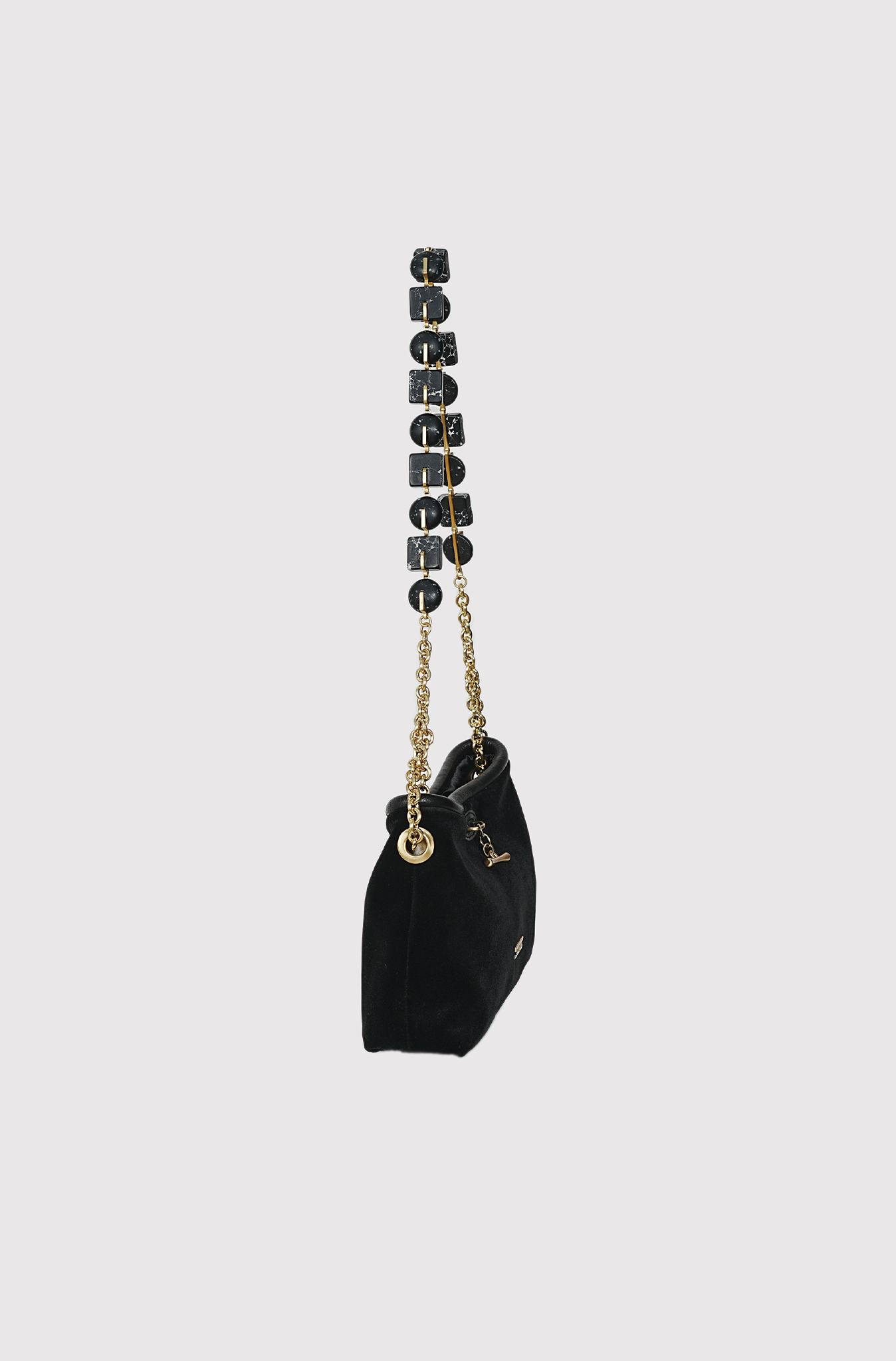 Cult Gaia’s Kiraz shoulder bag is a sophisticated choice for evening wear. It is crafted from soft velvet, trimmed with leather, and features a beaded chain strap that can be tucked inside for a more streamlined look.