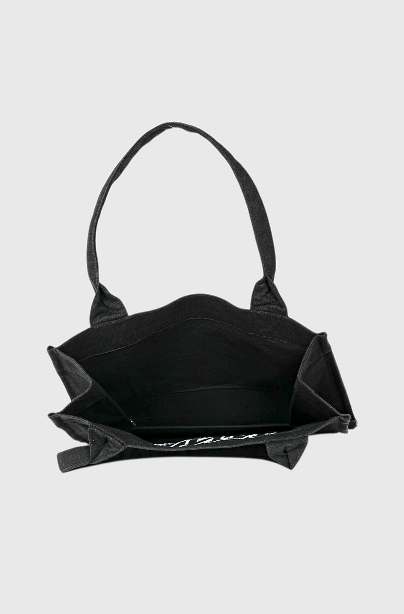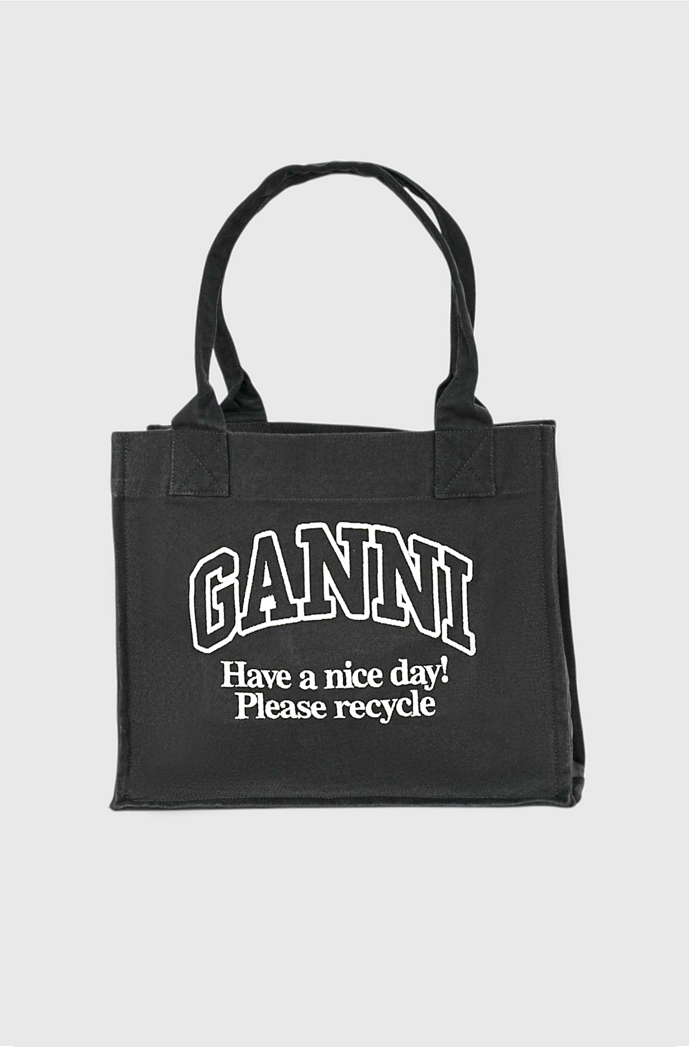 The Ganni large canvas tote features two top handles, one large compartment and an embroidered GANNI logo with the phrase ‘Have a nice day! Please recycle’. It is designed to accommodate your essentials such as an iPhone 16 Pro Max, wallet, sunglasses, keys, water bottle, pouch, gym clothes, and a 15” laptop, making it versatile for everyday use.