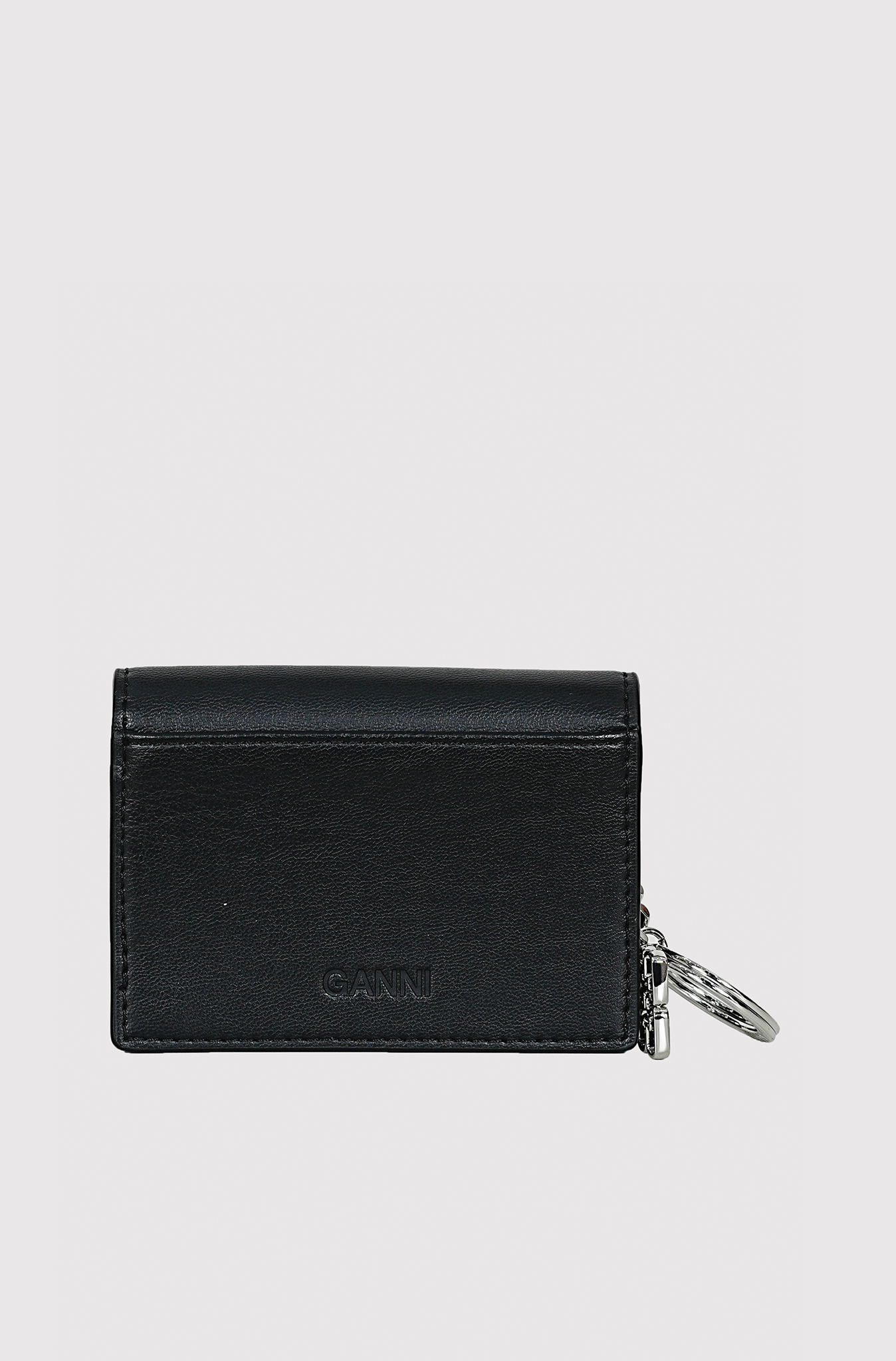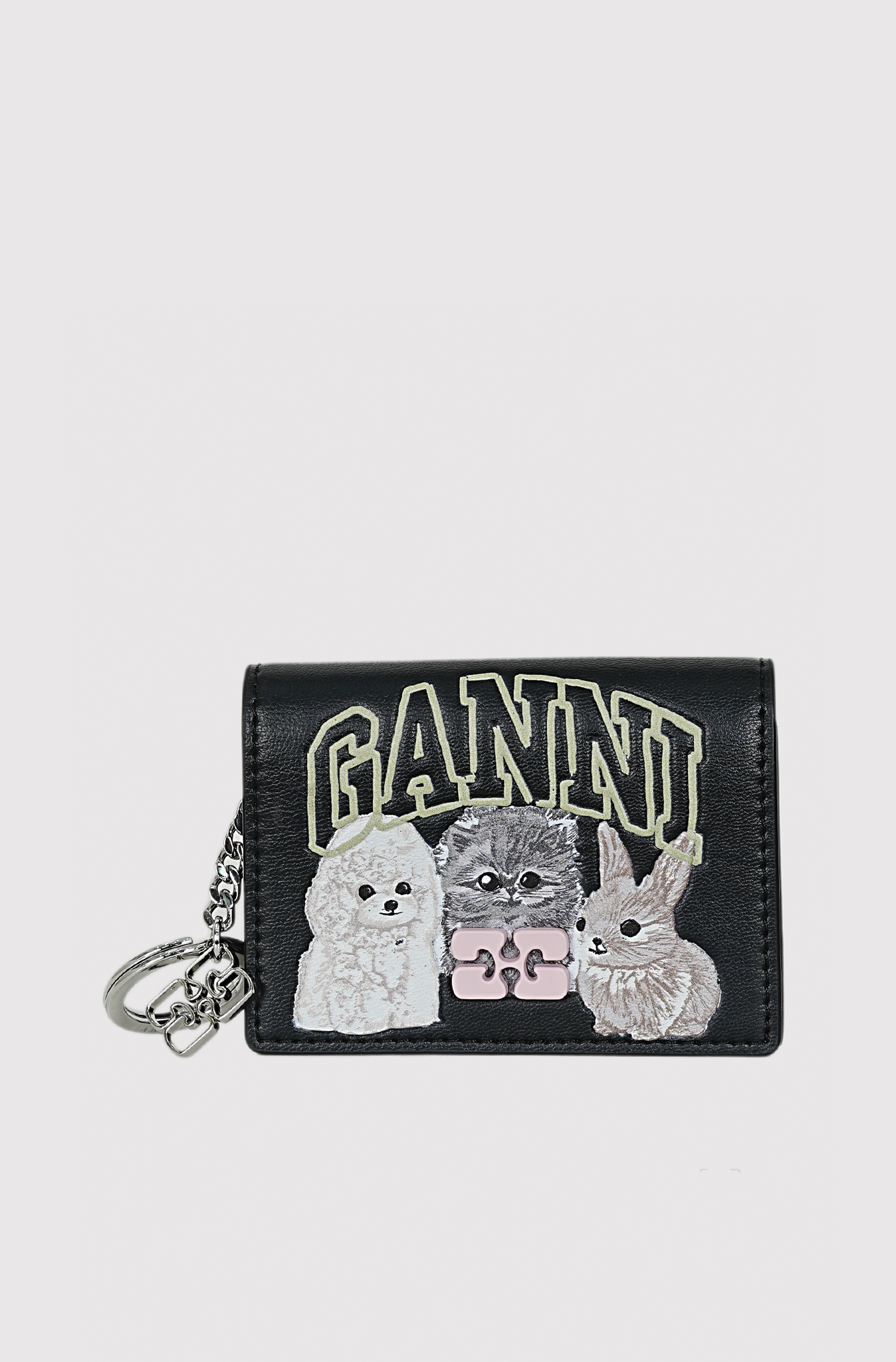 This piece features a GANNI Butterfly hardware logo and includes a keychain ring, card compartments, and an inner zipped pocket.