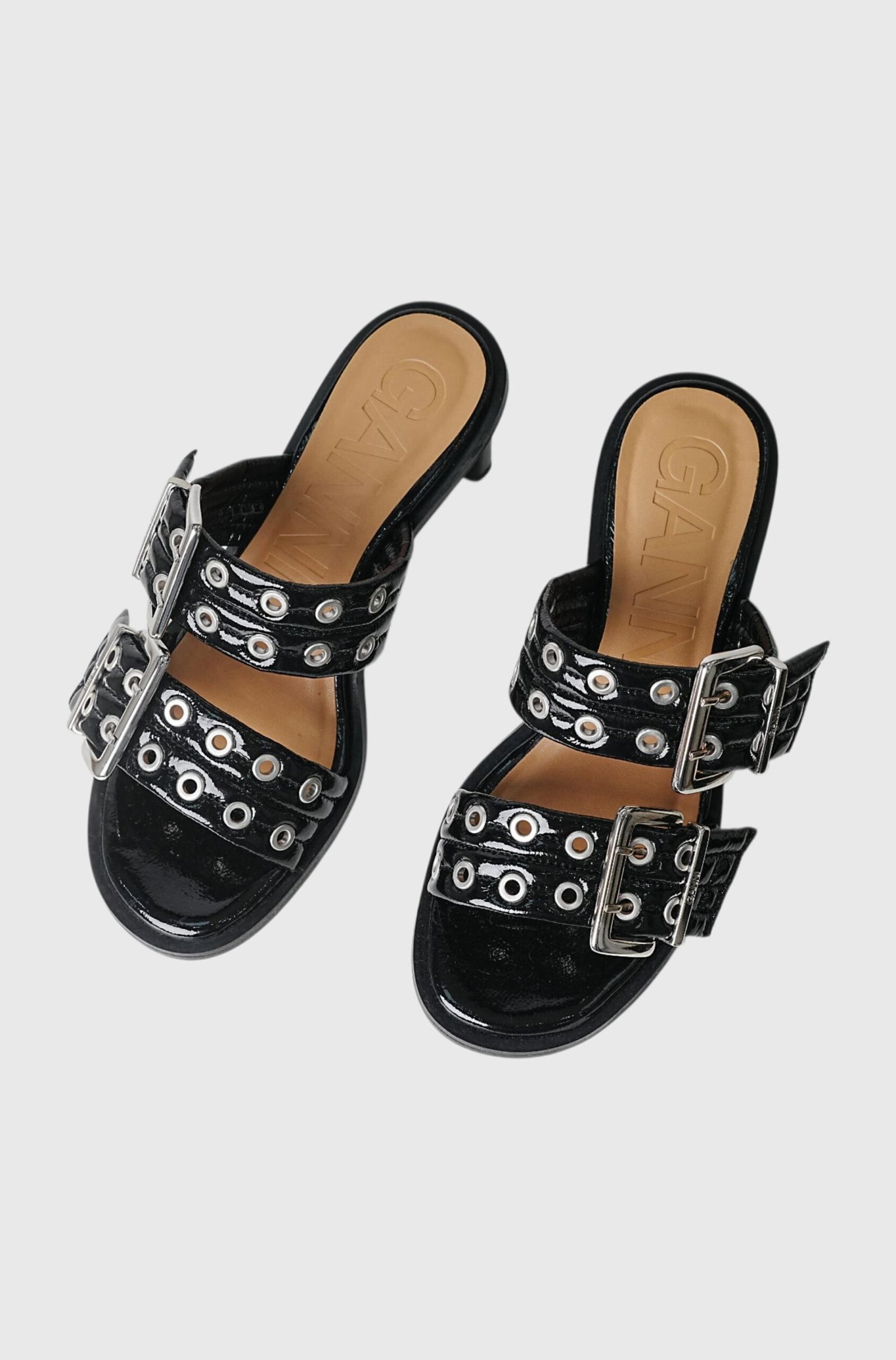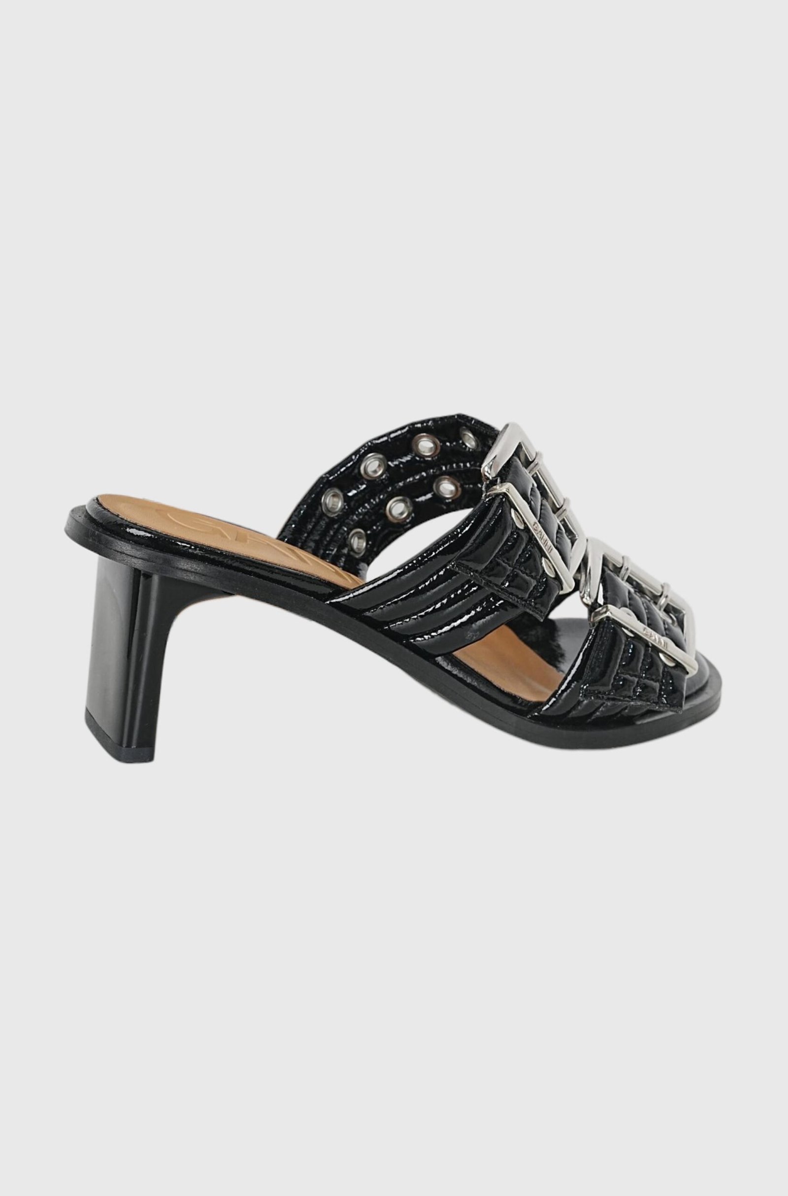 The GANNI buckle heel mule are crafted from glossy eco-leather and feature wide, quilted, adjustable straps. They are further embellished with elegant, oversized buckles and eyelets that span the entire length of the straps. The eco-leather insole is padded and includes a debossed logo, while the heel is lacquered and the sole is constructed from rubber.