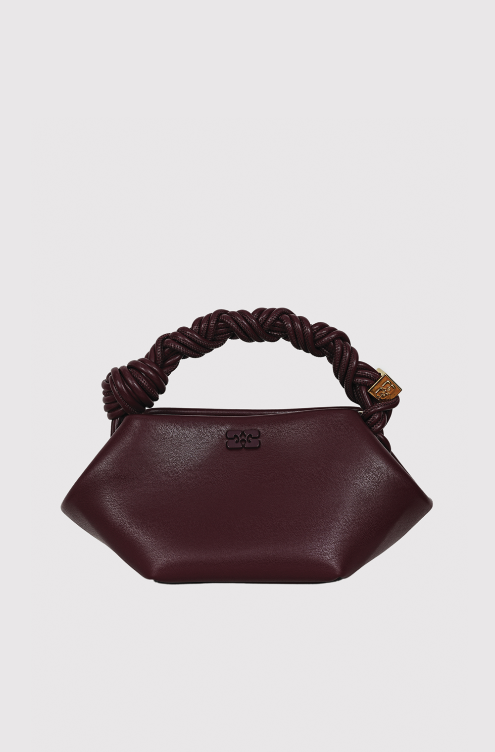 This bag features a tone-on-tone metallic GANNI Butterfly logo, a twisted handle with a braided knot, and an engraved gold-tone metallic dice with the GANNI Butterfly logo. The design includes an internal magnetic closure, a flat interior card pocket, and an adjustable, removable shoulder strap for crossbody wear.