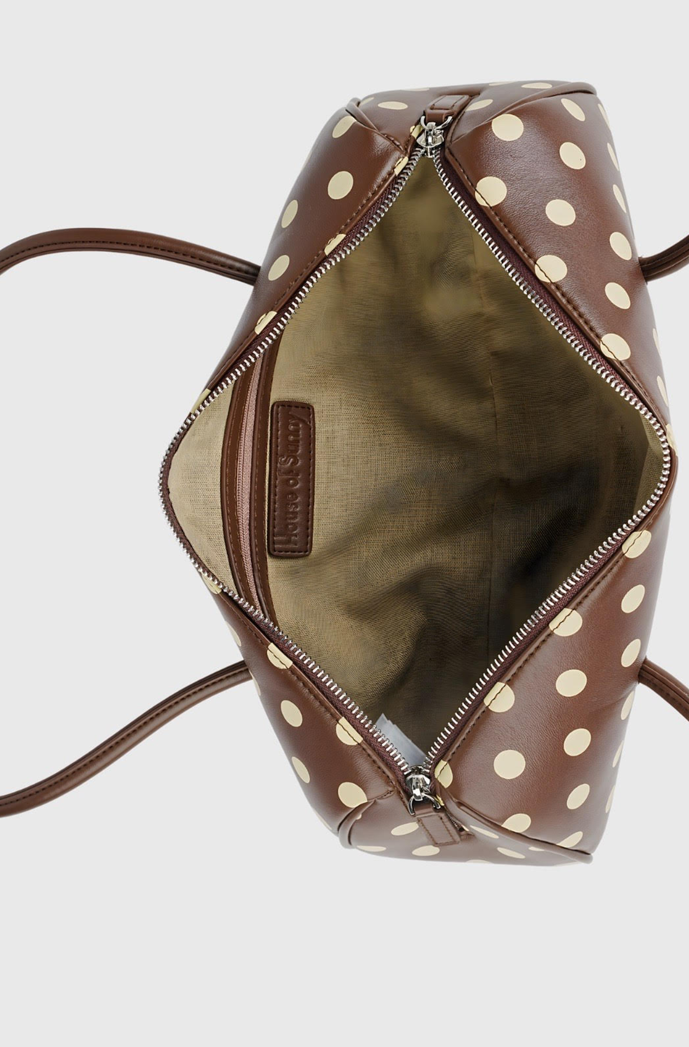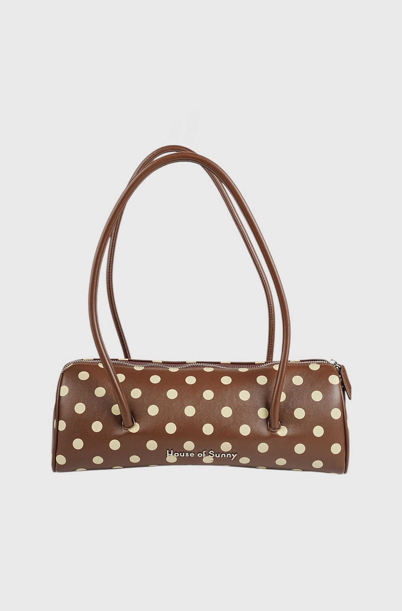 A statement accessory with a nostalgic twist, the House of Sunny Polka Dot Shoulder Bag in brown combines playful charm with modern elegance. The bold polka dot pattern adds a touch of retro flair, perfect for elevating both casual and dressy looks. It features a structured silhouette, smooth vegan leather finish, an internal zip pocket, and a double-sided zip fastening, making it both stylish and durable. It also includes a dust bag for storage and a distinctive metal logo.