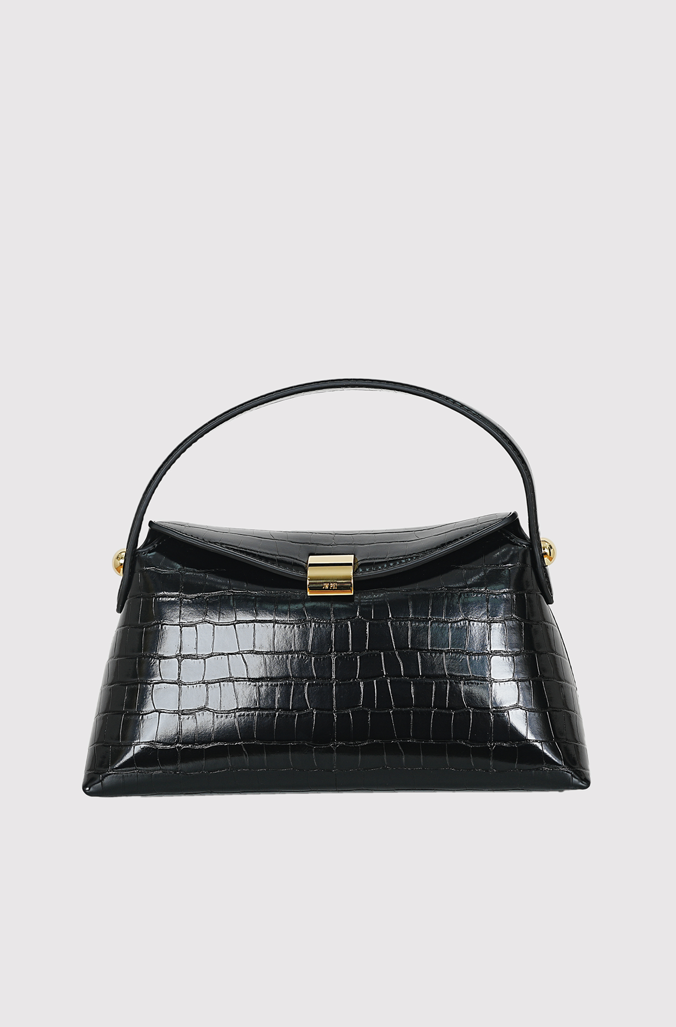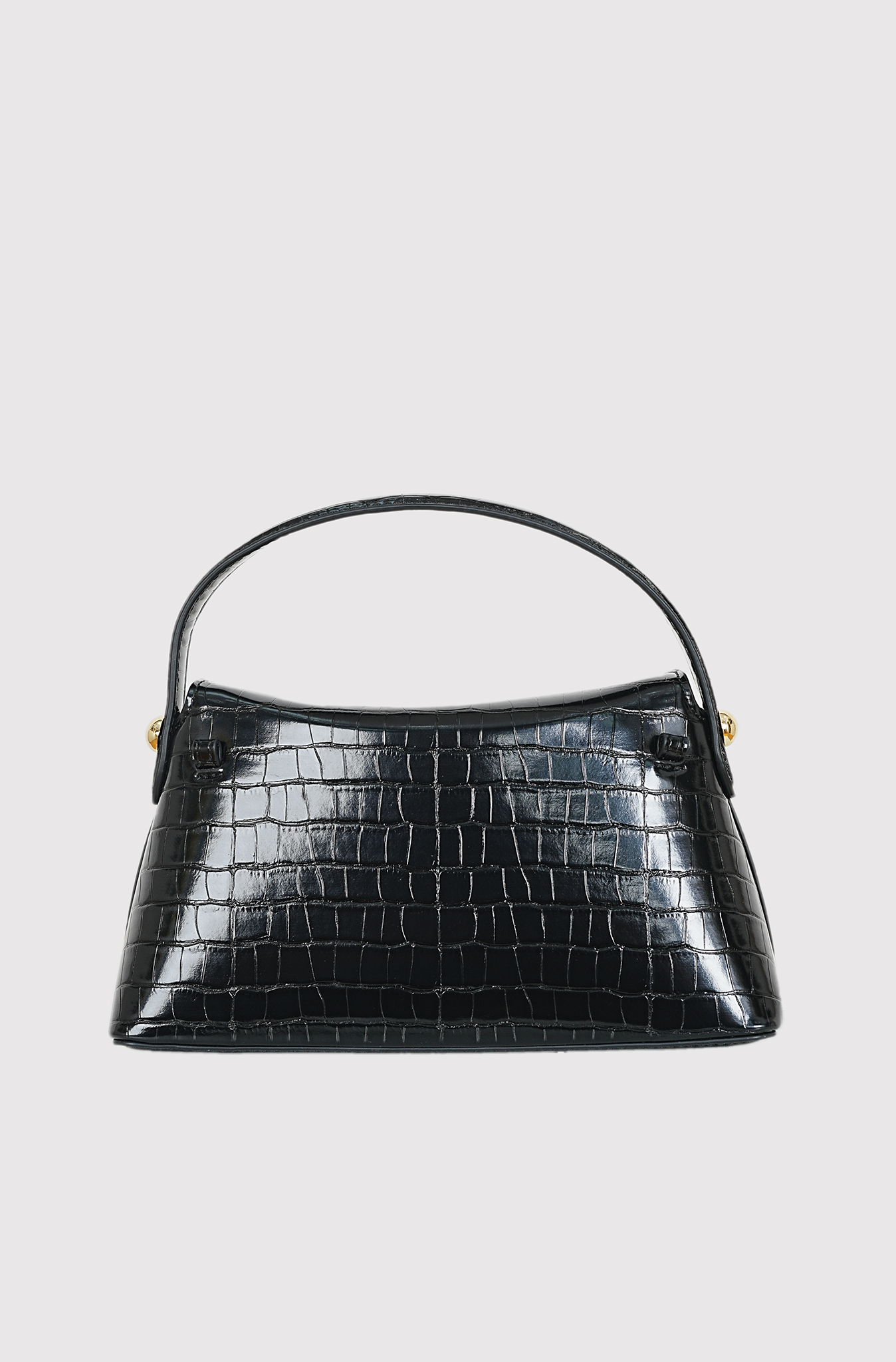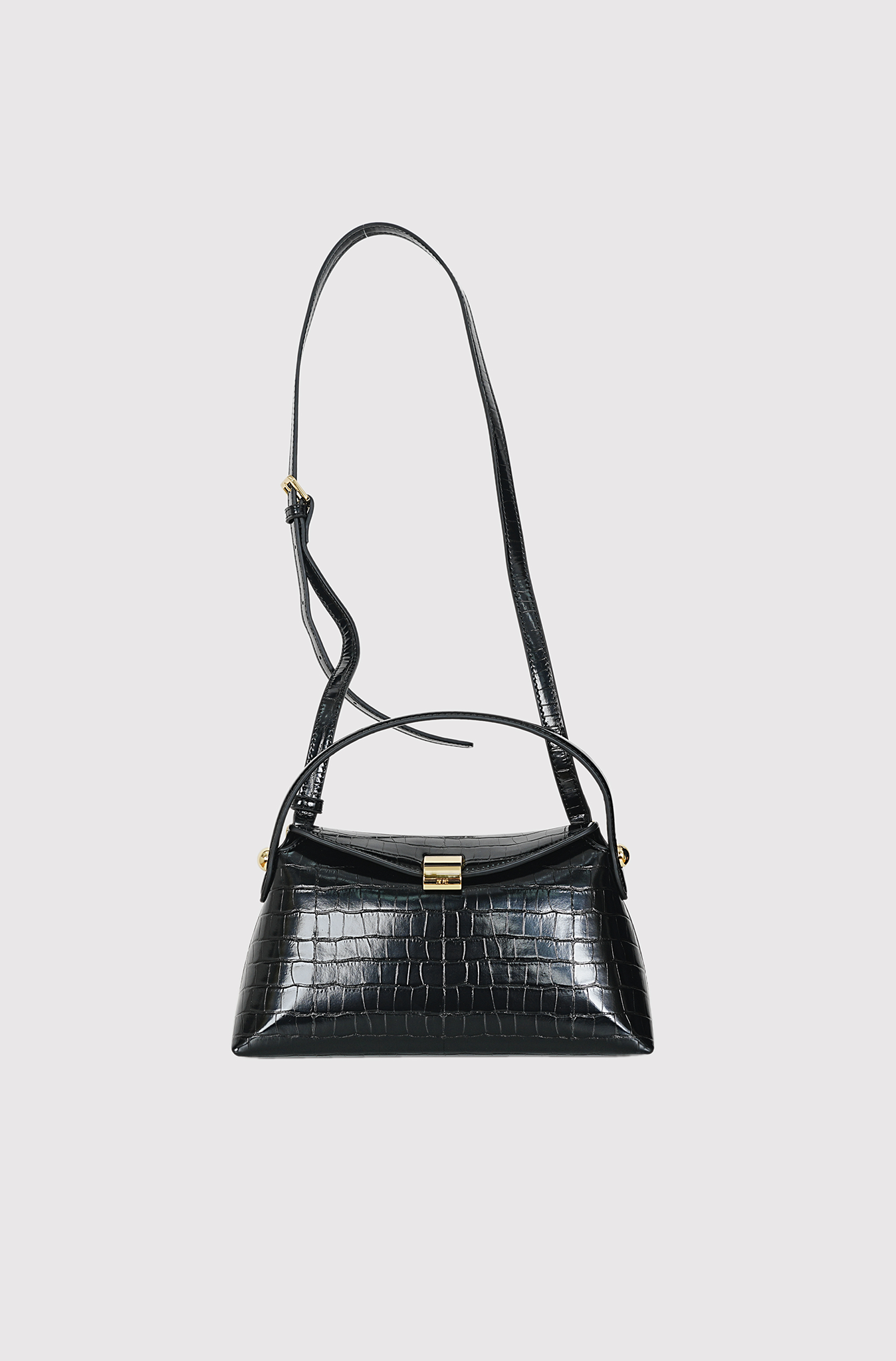 This piece is crafted from structured vegan leather with crocodile embossing and features elegant golden hardware. It boasts a sleek, glossy finish and includes one detachable, adjustable crossbody strap for versatile wear.