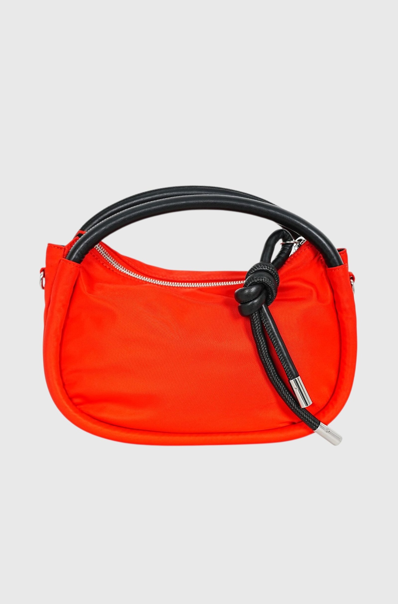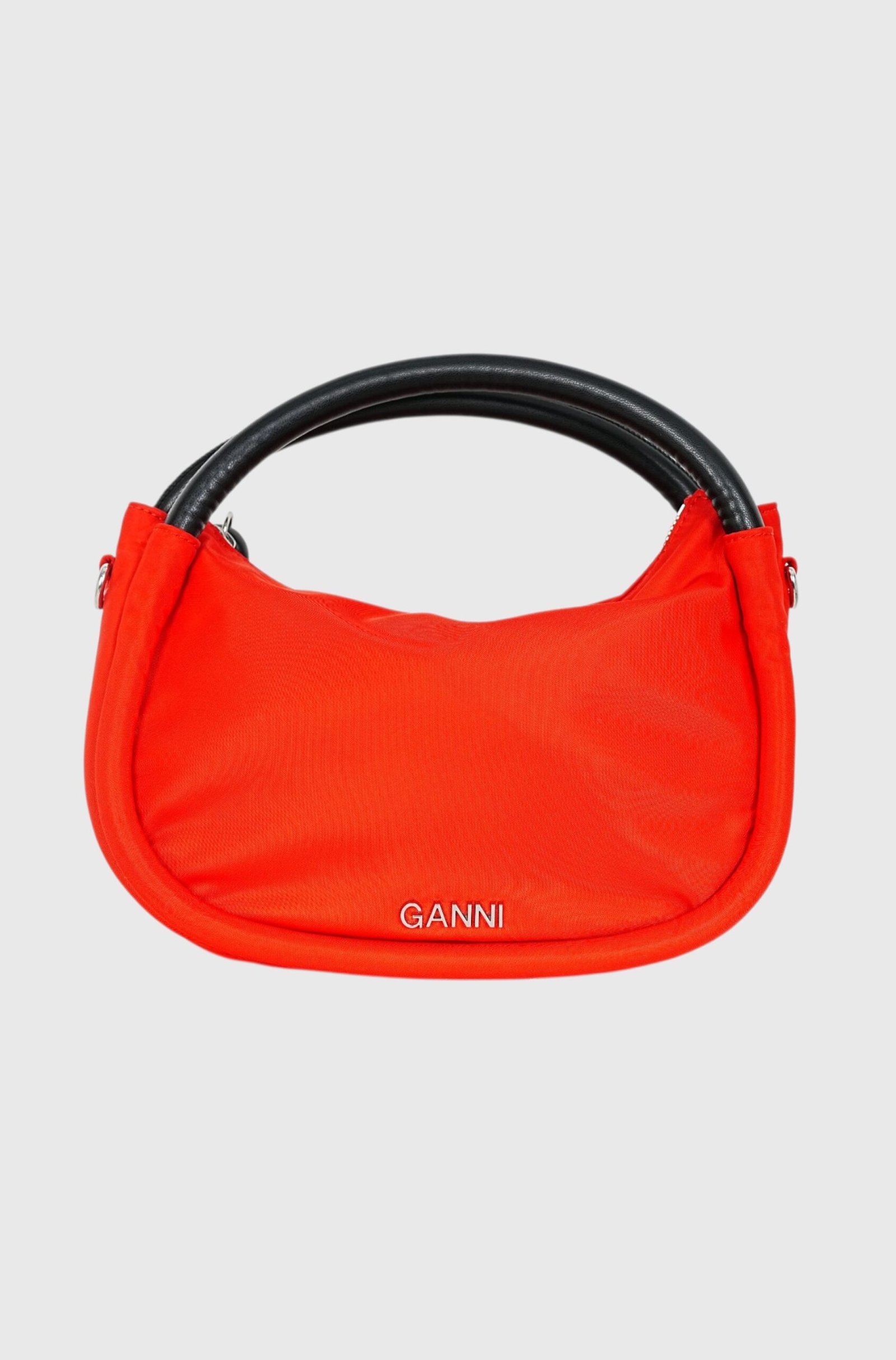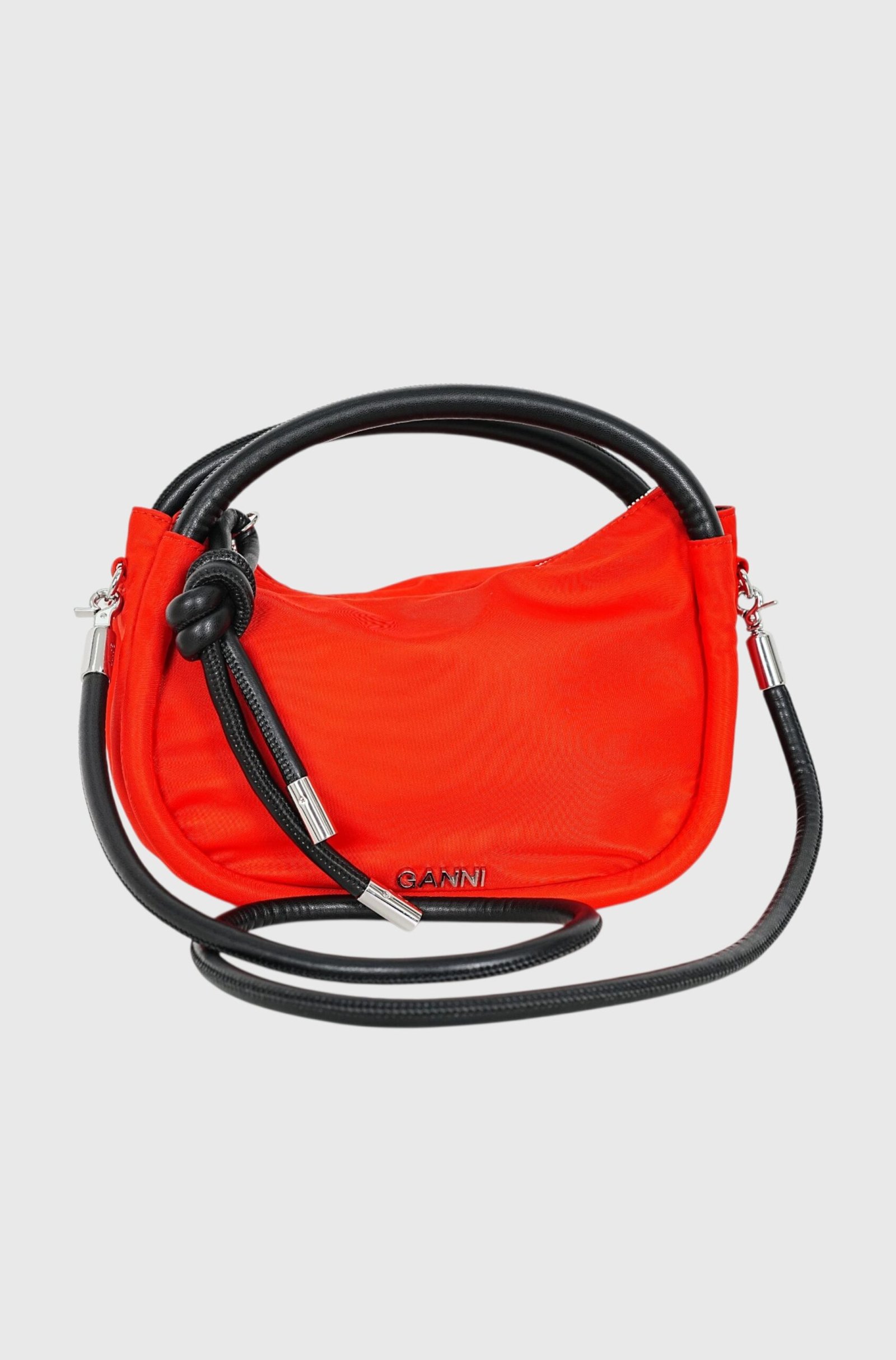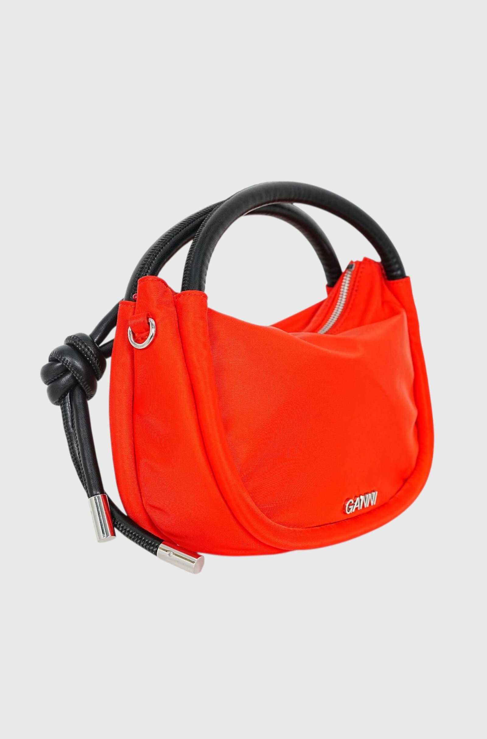 The Red Knot Mini Bag by Ganni. This item is crafted from a recycled leather blend and features a knotted top handle, a secure zip closure, and a detachable strap for versatility. The bag is also adorned with a metallic GANNI logo.