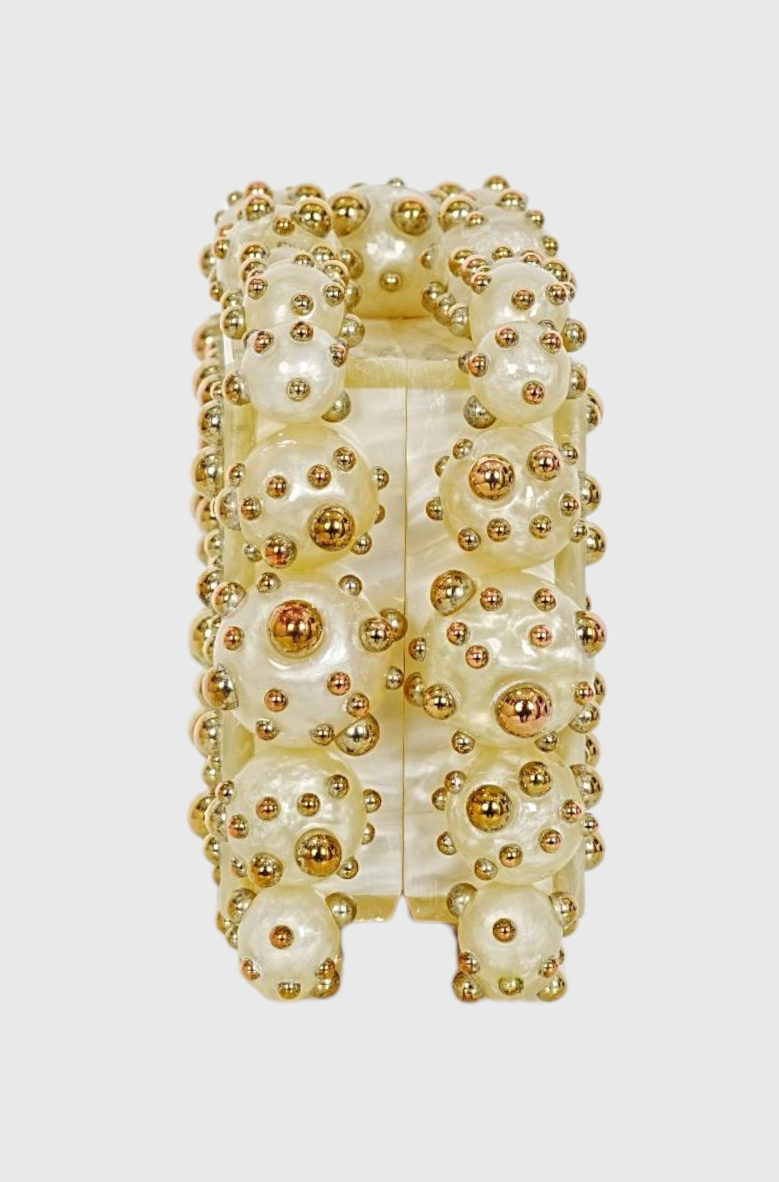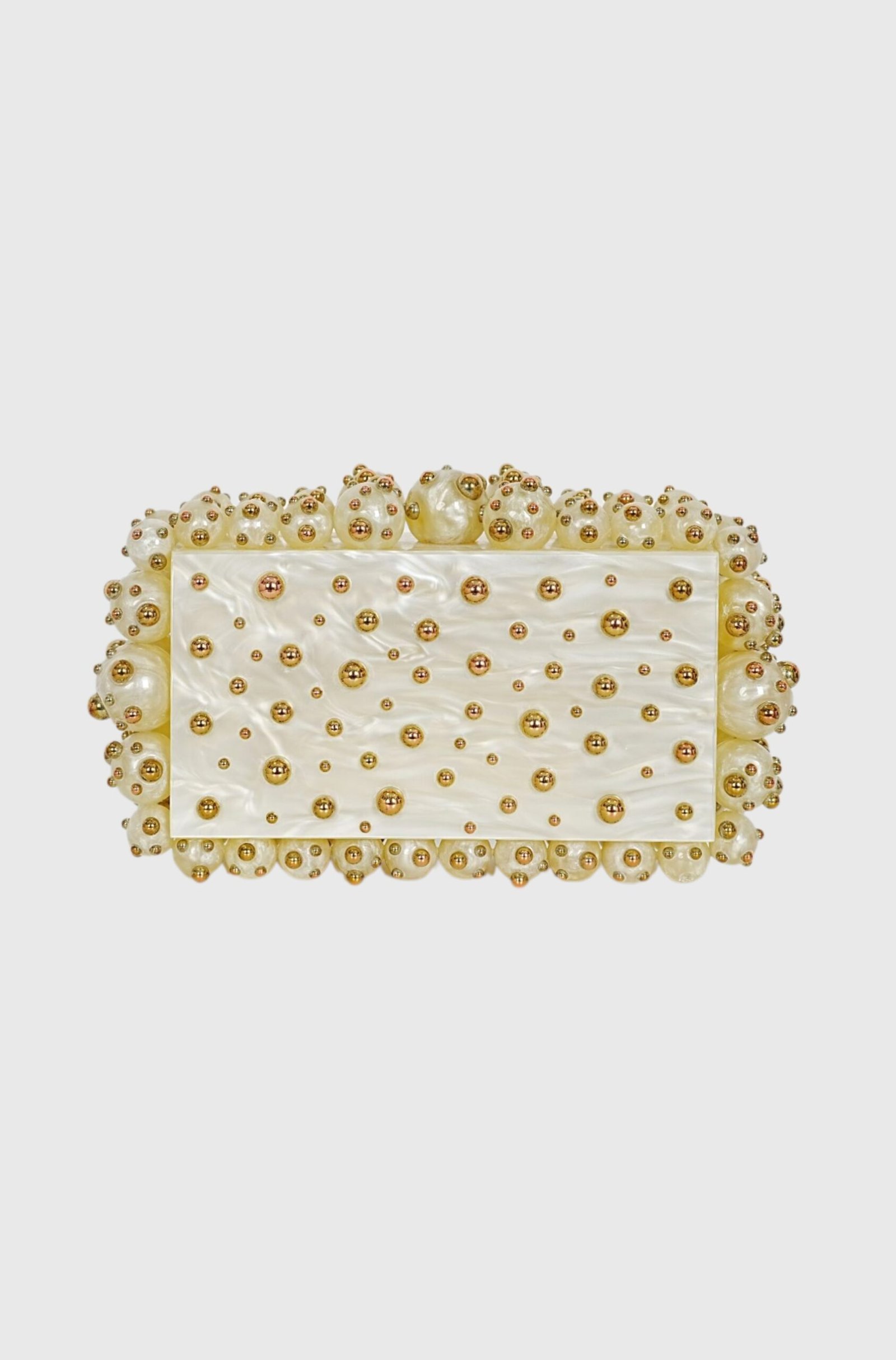 EOS clutch by Cult Gaia, which is truly a statement piece. This exquisite clutch features a striking acrylic exterior and interior, beautifully complemented by gold-tone bead detailing throughout. It has a structured frame with a top clasp closure, opening to one main compartment that is perfect for your essentials. This clutch is ideal for adding a touch of elegance and uniqueness to any outfit, whether for a special event or an evening out.