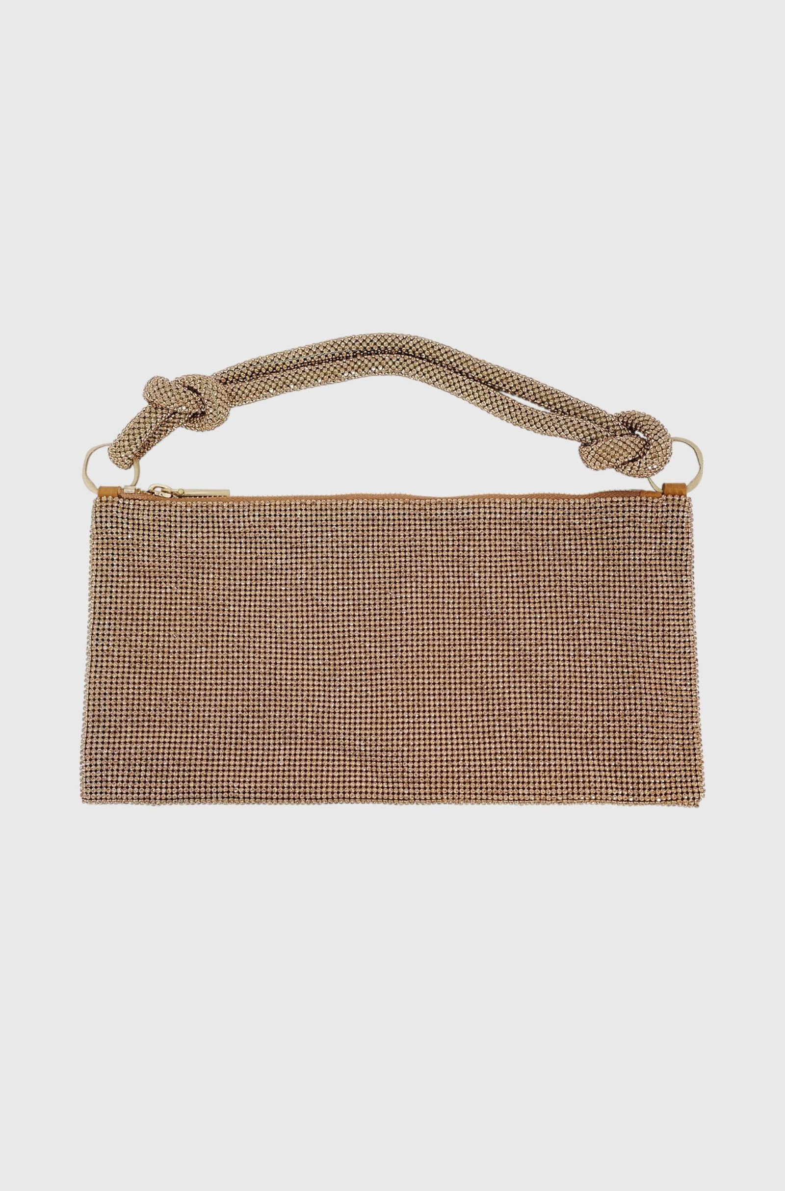 This classic Cult Gaia Hera Nano Rhinestone Shoulder is crafted from eye-catching gold-hued rhinestones that provide a metallic shine, exuding femininity and grace. It features a gorgeously slouchy silhouette and a knotted shoulder strap. The bag includes single handle with rhinestones, knot detail, zipper closure and single compartment.