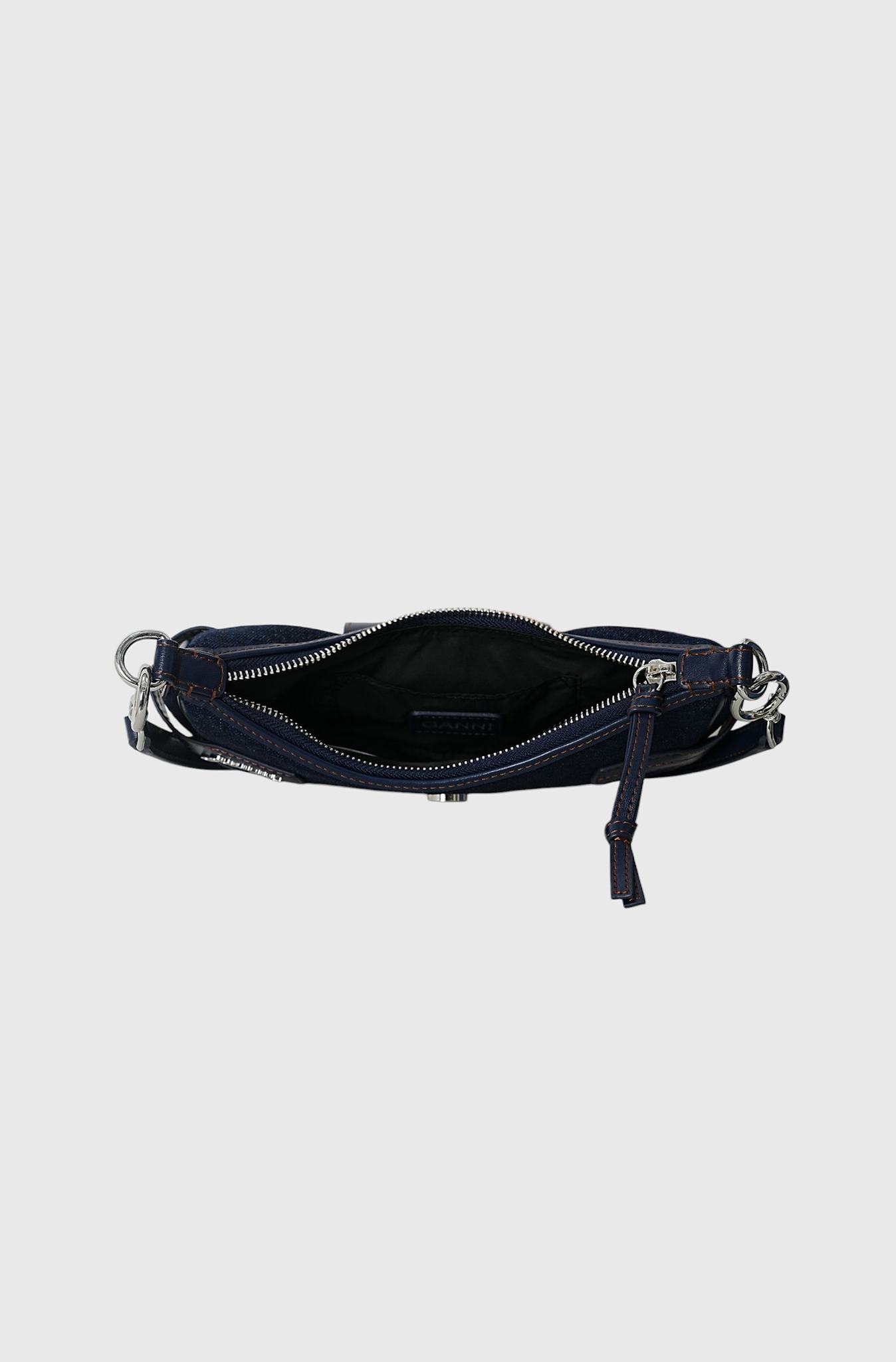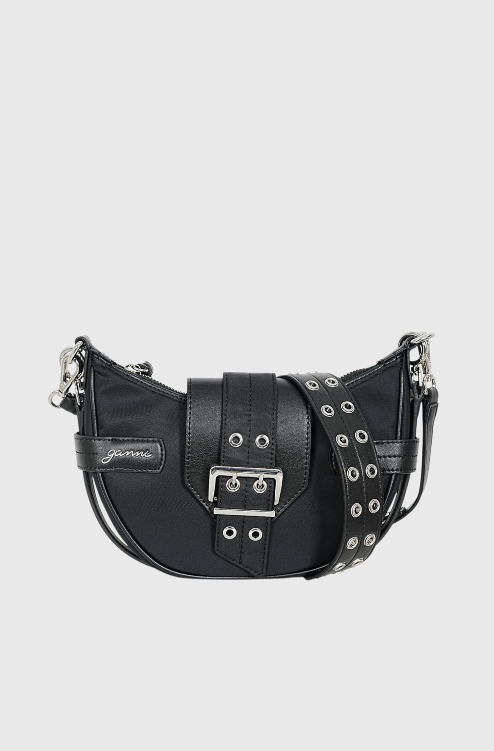 The Ganni Bucky bag features a distinctive half-moon shape with a flap adorned by a silver-tone buckle. It is designed for versatility, offering two are straps that allow it to be worn as either a shoulder or crossbody bag. Additional features include a secure top zip fastening and a slender shoulder strap that can be detached or neatly tucked away. The front of the bag is further enhanced with an embossed GANNI logo.