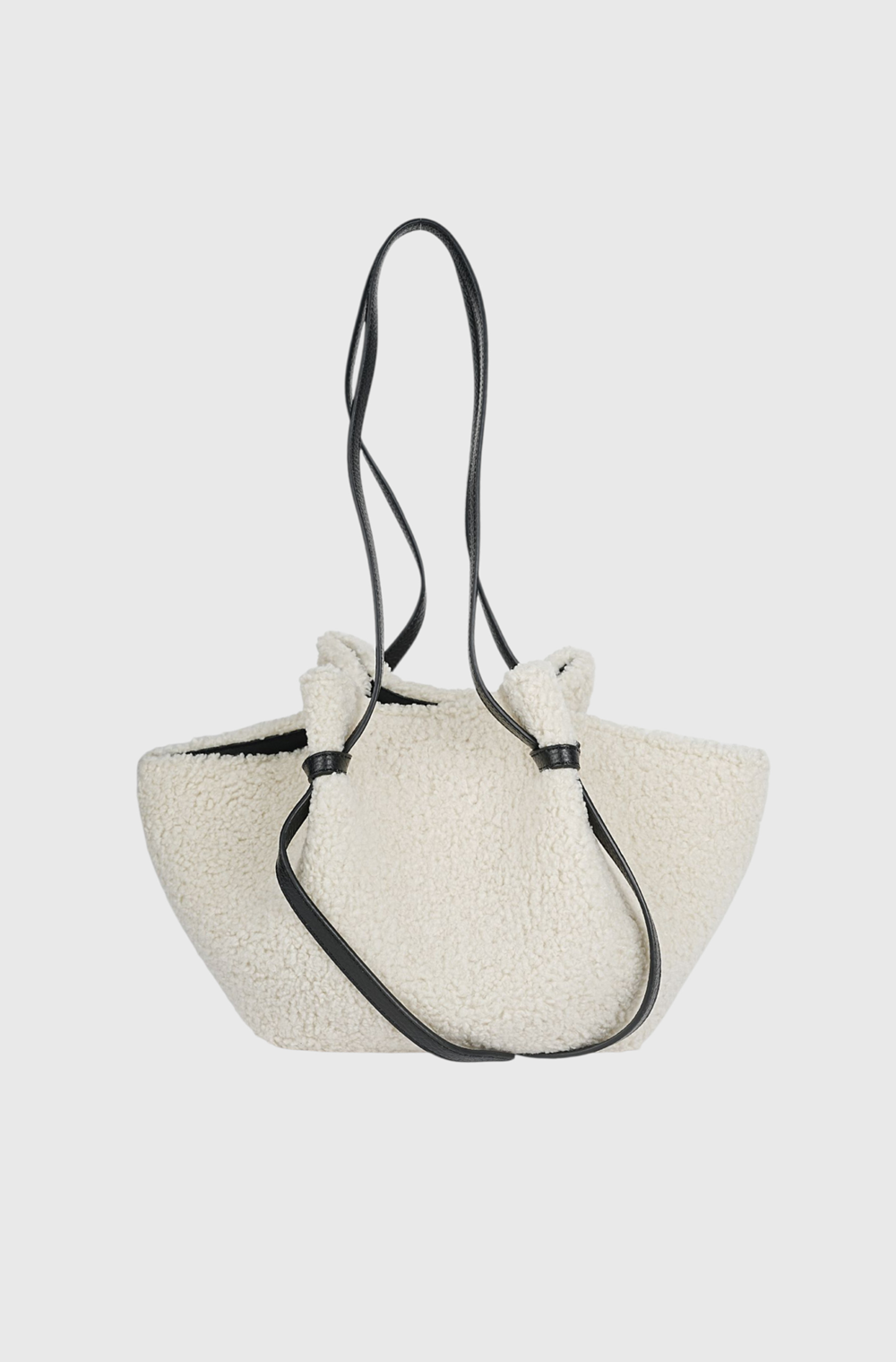 The Mochi Boucle Shoulder Bag in by Yuzefi combines a soft, rounded silhouette with a statement adjustable knot handle, offering a stylish and compact accessory that effortlessly elevates everyday outfits with a modern, minimalist touch.